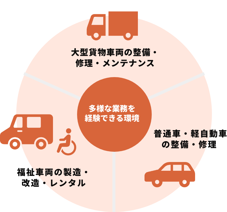 さらなるスキルアップを。独り立ちし、大型貨物車両や福祉車両の整備をメインで担当していただきます。溶接技術なども活用し、難易度の高い作業に挑戦してみてください。